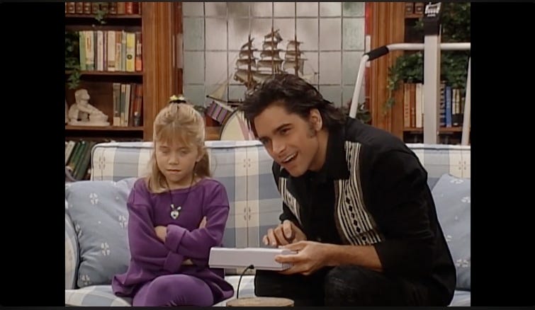 Parody of video games is also an element that pops up quite frequently. A sub-genre of this might be when a show or film creates “fake” names for games (this has practical applications too, related to licensing and copyright), such as in Full House,S8E9, where characters play a made-up game on the SNES.