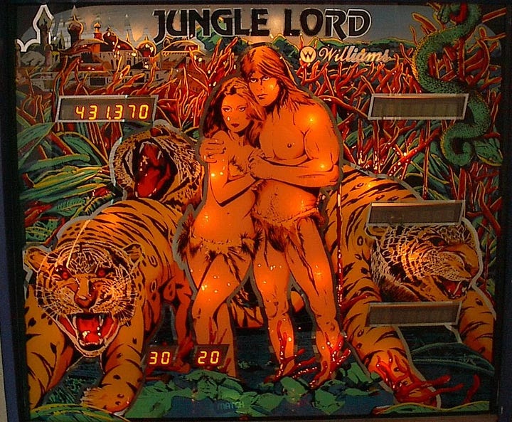 I almost gave this the top spot, mostly for it’s consitancy, Jungle Lord (1981) appears in the background of quite a few season 1 episodes. Interestingly, episode 3 of season 1 (it’s the first time any pinball machine is seen) is actually the pinball machine Nine Ball. (1980). In GOF#15, I speculated on the connection between Superman and a Tarzan-type character (as seen in the Jungle Lord back glass). One connection I didn’t mention in the original post is to the Crash Test Dummies song “Superman’s Song,” where the lyrics directly compare and contrast Superman and Tarzan.