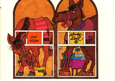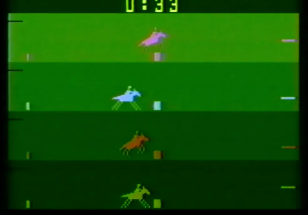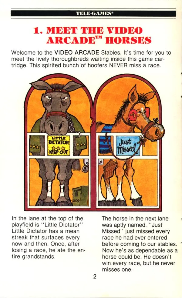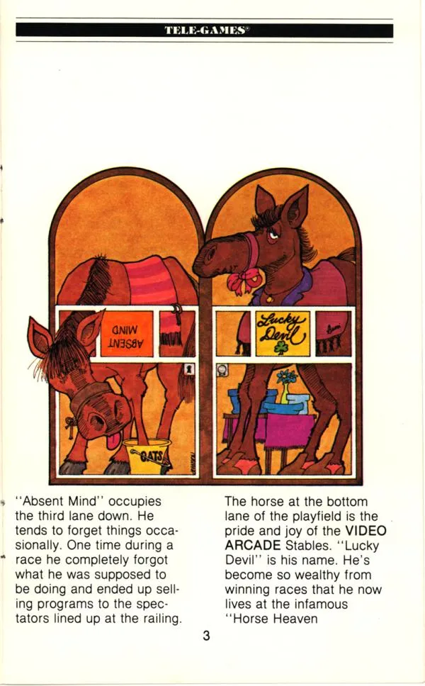 For its time, both the arcade and 2600 versions have nice animation and use of colour. Games back then weren’t exactly known for their storytelling; however, the manual actually includes a lot of personality, offering flavor text on each of the four horses.