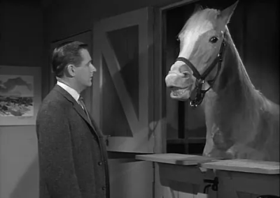 Wilber Post (Alan Young) and his wife, Carol (Connie Hines), move into their new home, and to their surprise, there is a stable in the back of their garden. (How they didn’t know about this, or why it wasn’t mentioned by the real estate agent, I’m not sure.)